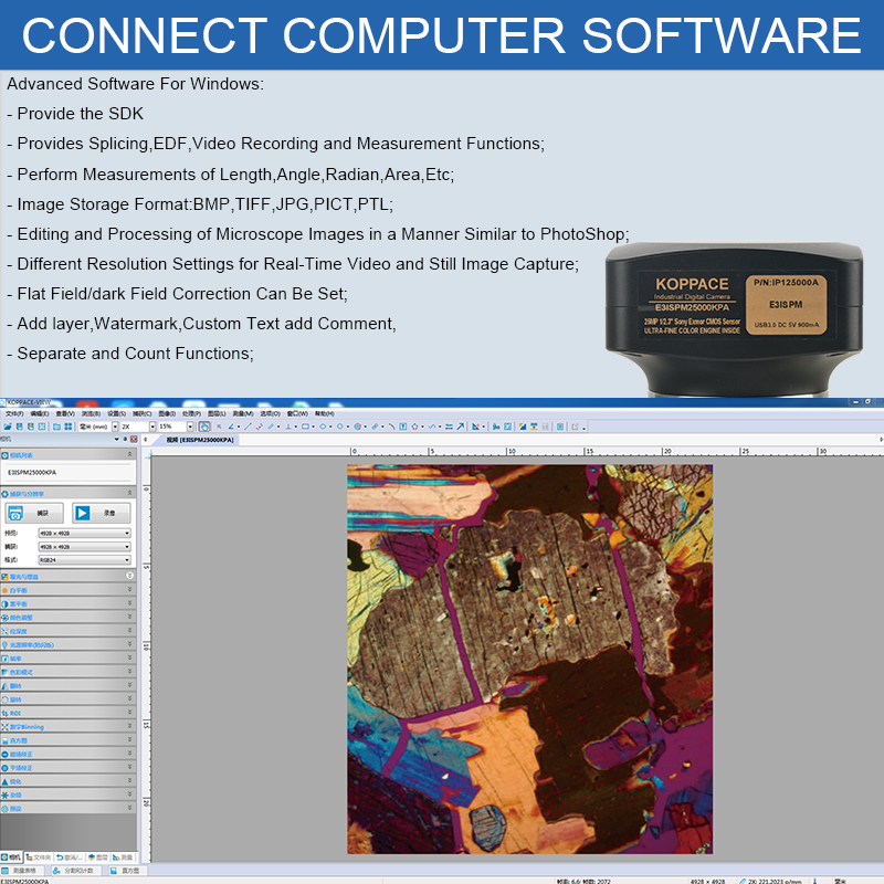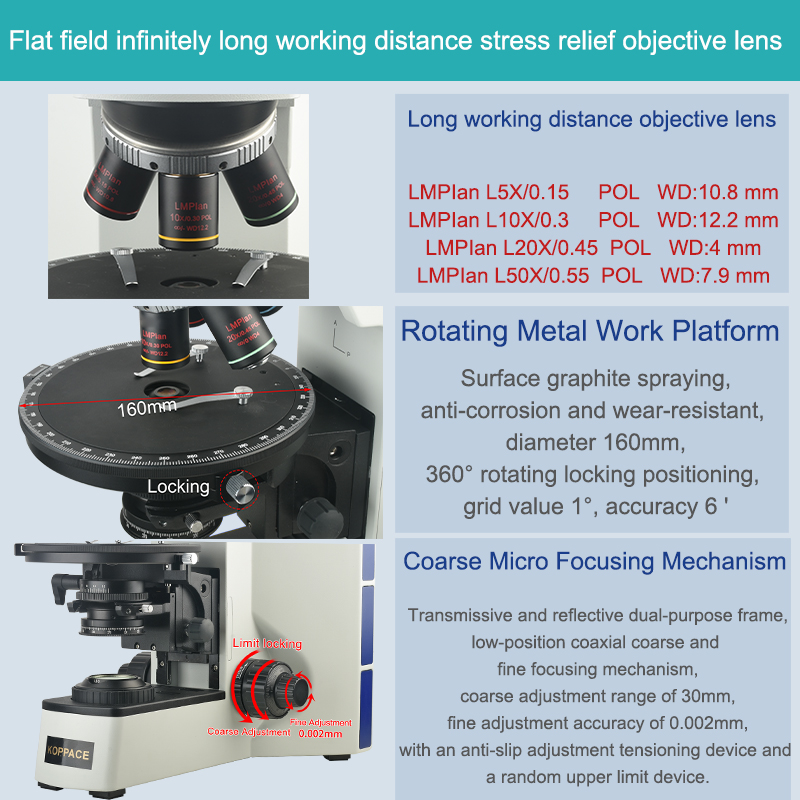 | Packing List | 1、Eyepiece PL10X/22mm one Pair 2、Three-lens includes 0.5X interface *1 3、Objective Lens LMPlan 5X/0.15 POLWD 10.8mm *1 4、Objective Lens LMPlan 10X/0.3 POL WD 12.2mm *1 5、Objective Lens LMPlan 20X/0.45 POL WD4mm *1 6、Objective Lens LMPlan FLN 50X/0.55 POL WD7.9mm *1 7、The Microscope Body *1 8、light Box Power Cord *1 9、Polarizing Mirror *1 10、Analyzer Mirror *1 11、Round Platform *1 12、LBD Color Filter Group (White Light) *1 13、λ Piece,λ/4 Pieces,Quartz Wedge *1 14、Color Filter *1 15、Condenser *1 16、25MP Camera *1 17、1.8m USB Cable *1 18、Software *1 19、Calibrating Ruler *1 |
