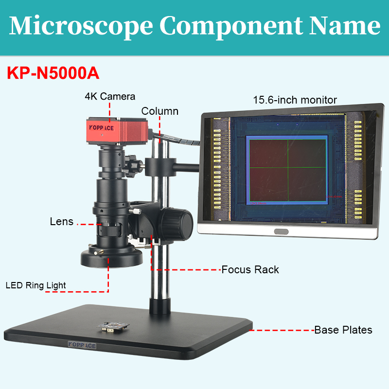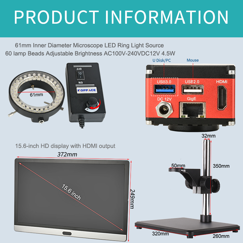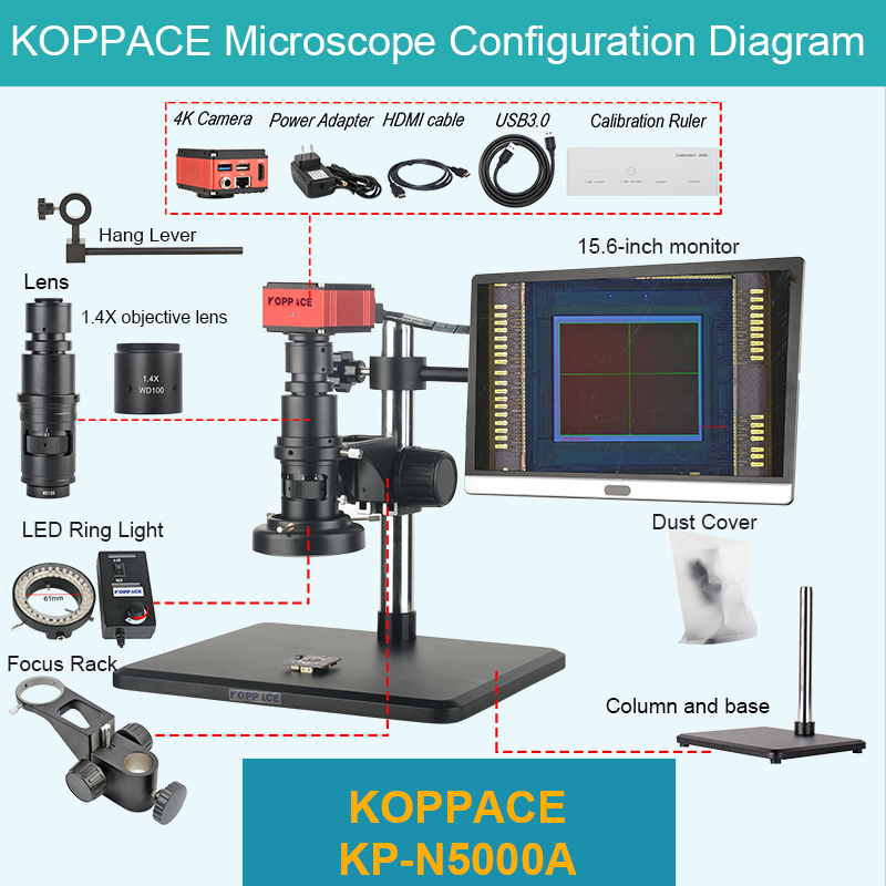 | Packing List | 1. Column and base *1 2. Focusing Bracket *1 3. Continuous Zoom Lens *1 4. 1.4X objective lens *1 5、LED Ring Light *1 6、Dust Cover *1 7、4K Camera *1 8、HDMI Line *1 9、The Camera Power Adapter *1 10、Calibrating Ruler *1 11、USB 3.0 Line *1 12、15.6 Inch Monitor *1 13、Hang Lever *1 |
