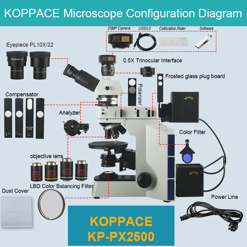 | Packing List | 1、Eyepiece PL10X/22mm one Pair 2、Three-lens includes 0.5X interface *1 3、Objective Lens LMPlan 5X/0.15 POLWD 10.8mm *1 4、Objective Lens LMPlan 10X/0.3 POL WD 12.2mm *1 5、Objective Lens LMPlan 20X/0.45 POL WD4mm *1 6、Objective Lens LMPlan FLN 50X/0.55 POL WD7.9mm *1 7、The Microscope Body *1 8、light Box Power Cord *1 9、Polarizing Mirror *1 10、Analyzer Mirror *1 11、Round Platform *1 12、LBD Color Filter Group (White Light) *1 13、λ Piece,λ/4 Pieces,Quartz Wedge *1 14、Color Filter *1 15、Condenser *1 16、25MP Camera *1 17、1.8m USB Cable *1 18、Software *1 19、Calibrating Ruler *1 |