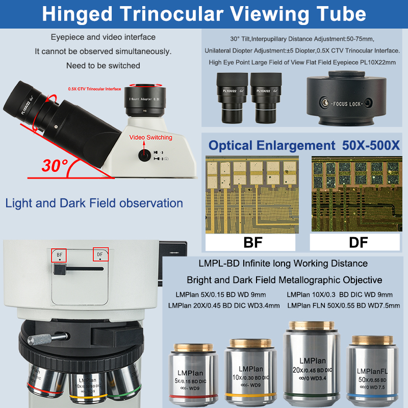 | Objective Lens | LMPL-BD Infinite long Working Distance Bright and Dark Field Metallographic Objective LMPlan 5X/0.15 BD WD 9mm LMPlan 10X/0.3 BD DIC WD 9mm LMPlan 20X/0.45 BD DIC WD 3.4mm LMPlan FLN 50X/0.55 BD WD 7.5mm |