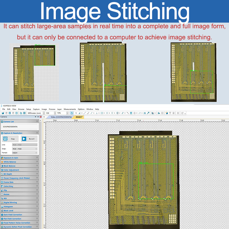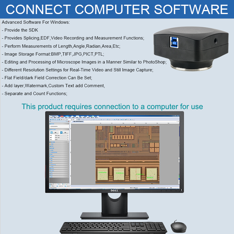 | Camera Function | Advanced software for Windows: - SDK Available - Provides Stitching,EDF,Video Recording and Measurement Functions - Measurement of Length,Angle,Radian,area,etc. - Save Still Images in BMP,TIFF,JPG,PICT,PTL or other Formats - Edit and Process microscope images in a manner similar to PhotoShop |