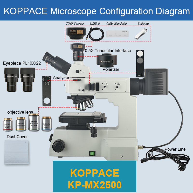 | Packing List | 1、A Pair of Eyepieces PL10X/22mm 2、0.5X Trinocular Interface *1 3、Objective lens LMPlan 5X/0.15 BD WD 9mm *1 4、Objective lens LMPlan 10X/0.3 BD DIC WD 9mm *1 5、Objective lens LMPlan 20X/0.45 BD DIC WD3.4mm *1 6、Objective lens LMPlan FLN 50X/0.55 BD WD7.5mm *1 7、Microscope Body *1 8、Light Box Power Cord *1 9、Analyzer *1 10、Polarizer *1 11、4-inch Platform *1 12、Dust Cover *1 13、25MP Camera *1 14、1.8m USB Cable *1 15、CD Software *1 16、Calibrating Ruler *1 |
