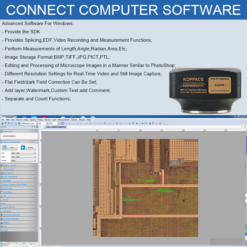 | Camera Function | Advanced Software For Windows: - Provide the SDK - Provides Splicing,EDF,Video Recording and Measurement Functions; - Perform Measurements of Length,Angle,Radian,Area,Etc; |