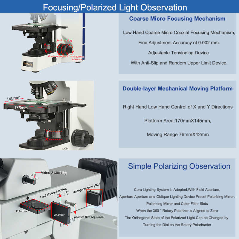 | Focusing System | low-Handed Coarse and Micro-Coaxial Focusing Mechanism,Coarse Adjustment Stroke 28mm,Fine Adjustment Accuracy 0.002mm.Adjustable Tensioning Device With Anti-Slip and Random upper limit Device.Up and Down Adjustment Mechanism With Platform Position,Maximum Sample Height 28mm |