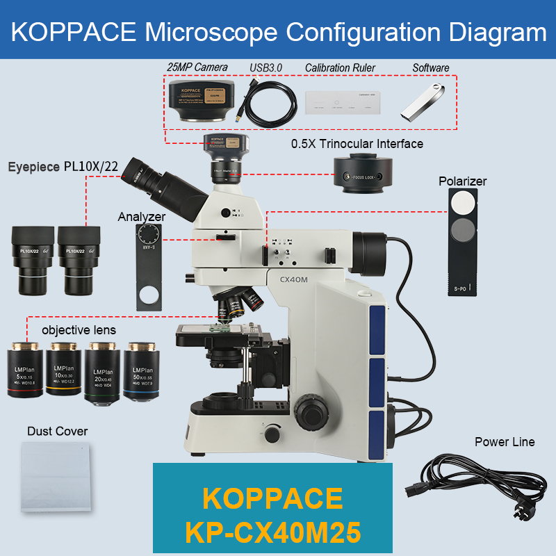 | Packing List | 1. Eyepiece PL10X/22mm One Pair 2. Objective Lens LMPlan 5X * 1 3. Objective Lens LMPlan 10X * 1 4. Objective Lens LMPlan20X * 1 5. Objective Lens LMPlan50X * 1 6. Microscope Body * 1 7. Trinocular Lens * 1 8. 0.5X Trinocular Lens * 1 9. Power Cord * 1 10、Polarizer *1 11、Analyzer *1 12、Dust Cover *1 13、25MP Camera *1 14、1.8m USB Cable *1 15、CD Software *1 16、Calibrating Ruler *1 |