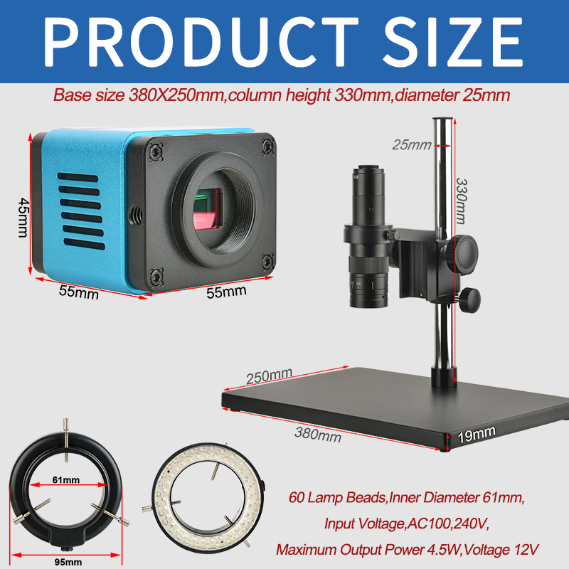 Packing List | 1. Pillar Stand and Base Plate *1 2. Focusing Bracket *1 3. Anti-Skid Ring *1 4. Continuous Zoom Lens *1 5、LED Ring Light *1 6、Dust Cover *1 7、4K Camera *1 8、HDMI Line *1 9、The Camera Power Adapter *1 10、Type-C Line *1 11、Software *1 12、Remote Control *1 |