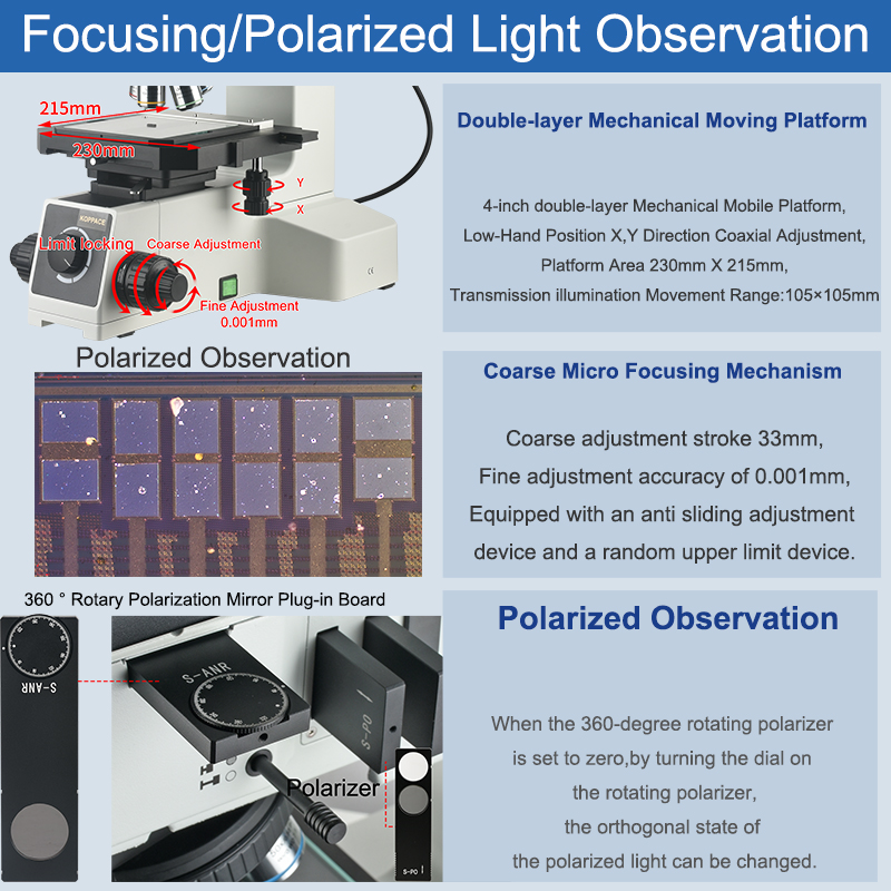 | Operating Platform | 4-inch double-layer Mechanical Mobile Platform,Low-Hand Position X,Y Direction Coaxial Adjustment,Platform Area 230mm X 215mm,Transmission illumination Movement Range:105X105mm |