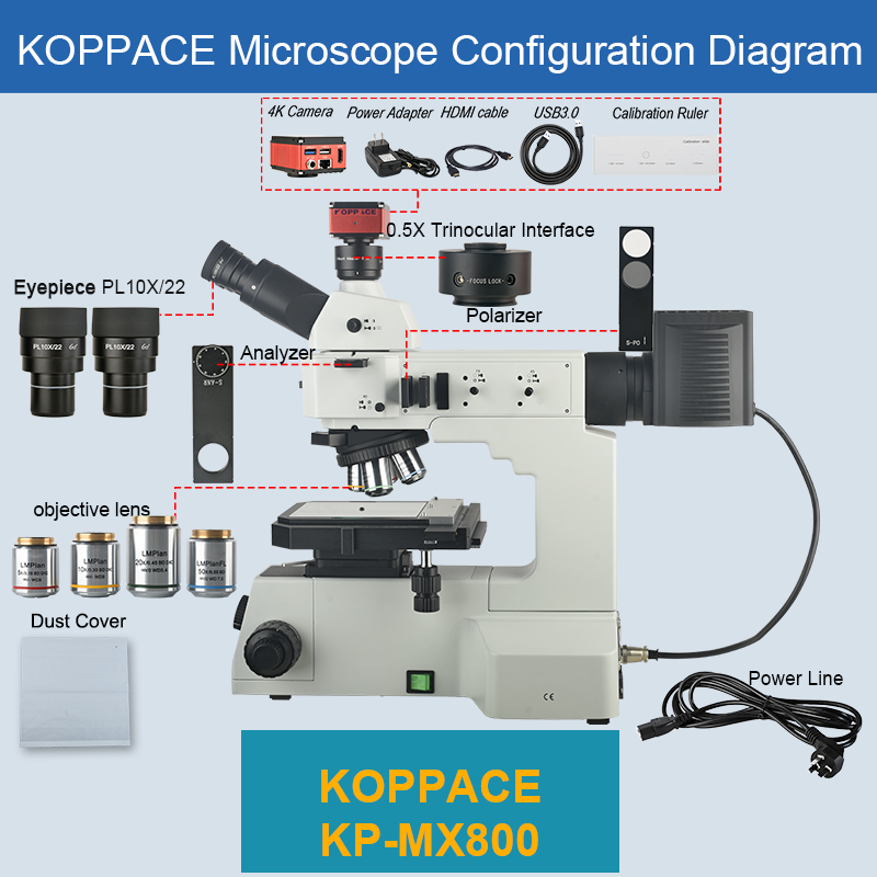 | Packing list | 1、A Pair of Eyepieces PL10X/22mm 2、0.5X Trinocular Interface *1 3、Objective lens LMPlan 5X/0.15 BD WD 9mm *1 4、Objective lens LMPlan 10X/0.3 BD DIC WD 9mm *1 5、Objective lens LMPlan 20X/0.45 BD DIC WD3.4mm *1 6、Objective lens LMPlan FLN 50X/0.55 BD WD7.5mm *1 7、Microscope Body *1 8、Light Box Power Cord *1 9、Analyzer *1 10、Polarizer *1 11、4-inch Platform *1 12、Dust Cover *1 13、4K Camera *1 14、HDMI Line *1 15、The Camera Power Adapter *1 16、Calibrating Ruler *1 17、USB 3.0 Line *1 |