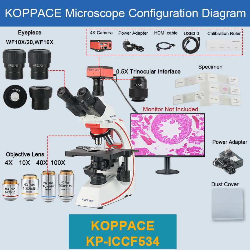| Packing List | 1、Eyepiece WF10X/20 *2 2、Eyepiece WF16X *2 3、Objective lens HC PLAN 4X *1 4、Objective lens HC PLAN 10X *1 5、Objective lens HC PLAN 40X *1 6、Objective lens HC PLAN 100X *1 7、Trinocular Microscope Body *1 8、0.5X Trinocular Interface *1 9、Power adapter *1 10、5 Pieces Specimen *1 11、Dust Cover *1 12、4K Camera *1 13、HDMI Line *1 14、Camera Power Supply *1 15、Calibrating Ruler *1 16、USB 3.0 Line *1 |