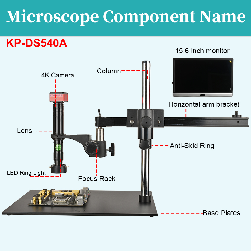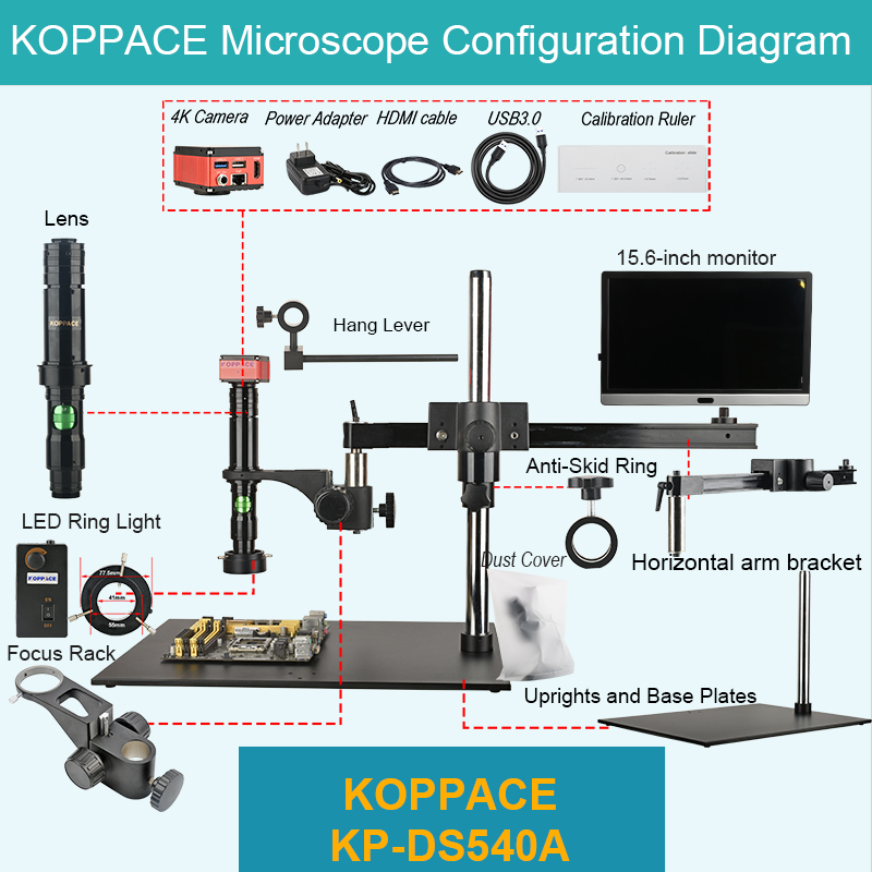 | Packing List | 1. Uprights and Base Plates *1 2. Focusing Bracket *1 3. Anti-Skid Ring *1 4. Continuous Zoom Lens *1 5. Cross arm Bracket *1 6、LED Ring Light *1 7、Dust Cover *1 8、4K Camera *1 9、HDMI Line *1 10、The Camera Power Adapter *1 11、Calibrating Ruler *1 12、USB 3.0 Line *1 13、15.6 Inch Monitor *1 14、Hang Lever *1 |