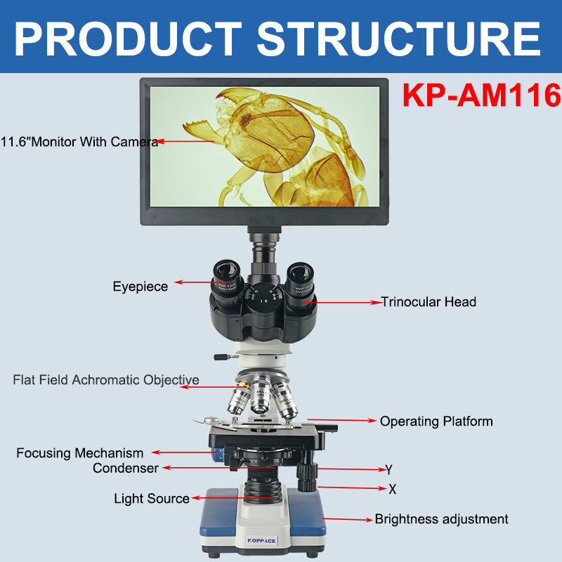 | Packing List | 1、Eyepiece WF10X/DIN18mm *2 2、Eyepiece WF25X *2 3、Objective Lens 4X *1 4、Objective Lens 10X *1 5、Objective Lens 40X *1 6、Objective Lens 100X *1 7、Trinocular Microscope Body *1 8、Electronic Eyepiece Interface *1 9、Power Adapter *1 10、5 Pieces Specimen *1 11、Dust Cover *1 12、2MP 11.6 "all-in-one Display *1 13、USB2.0 Line *1 14、Software *1 15、Mouse *1 |