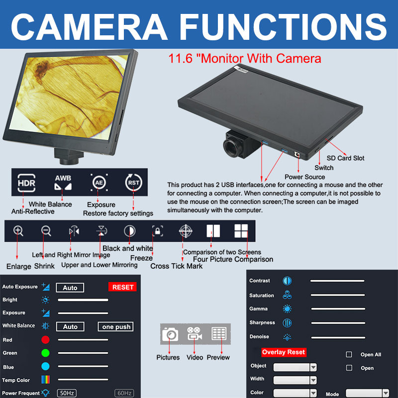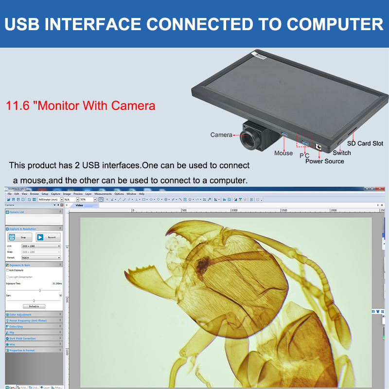 | USB Function | This Product Mainly Through the 11.6 inch Screen Display, USB Interface Can be Connected to the Mouse,Also can be Connected to the Computer Through the USB Cable,Connected to the Computer we Provide Professional Image Software. |