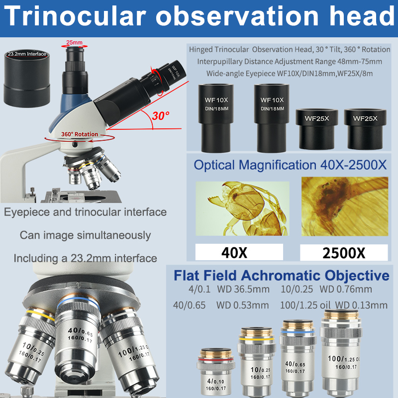| Observation tube | Hinge Trinocular,30 Degrees Inclined,360 Degrees Rotate,Interpupillary Distance Adjustment Range 48mm-75mm |
