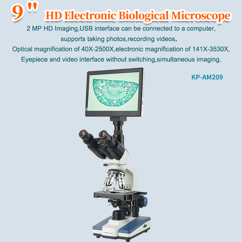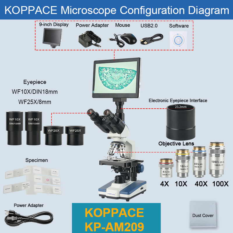 | Packing List | 1、Eyepiece WF10X/DIN18mm *2 2、Eyepiece WF25X *2 3、Objective Lens 4X *1 4、Objective Lens 10X *1 5、Objective Lens 40X *1 6、Objective Lens 100X *1 7、Trinocular Microscope Body *1 8、Electronic Eyepiece Interface *1 9、Power Adapter *1 10、5 Pieces Specimen *1 11、Dust Cover *1 12、2MP 9 "all-in-one Display *1 13、USB2.0 Line *1 14、Software *1 15、Mouse *1 |