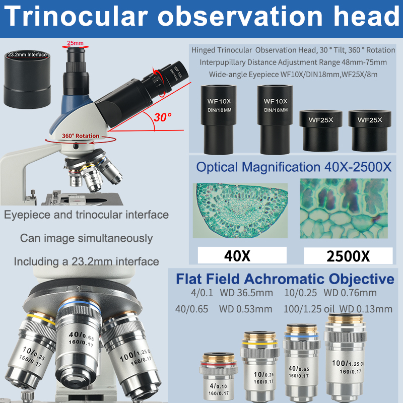 | Observation tube | Hinge Trinocular,30 Degrees Inclined,360 Degrees Rotate,Interpupillary Distance Adjustment Range 48mm-75mm |