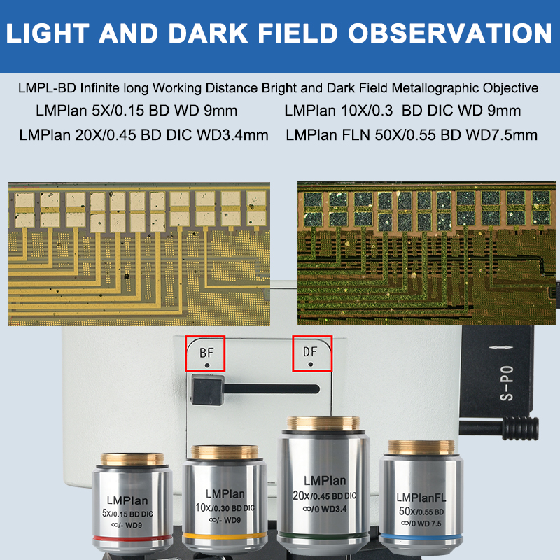 | Objective Lens | LMPL-BD Infinite long Working Distance Bright and Dark Field Metallographic Objective LMPlan 5X/0.15 BD WD 9mm LMPlan 10X/0.3 BD DIC WD 9mm LMPlan 20X/0.45 BD DIC WD 3.4mm LMPlan FLN 50X/0.55 BD WD 7.5mm |