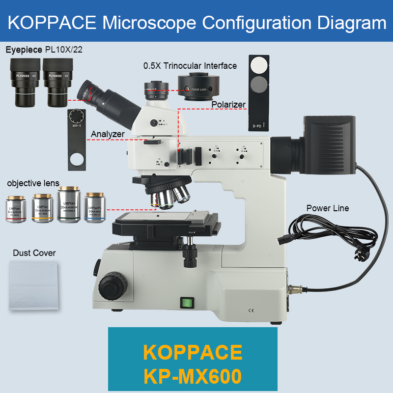 | Packing list | 1、A Pair of Eyepieces PL10X/22mm 2、0.5X Trinocular Interface *1 3、Objective lens LMPlan 5X/0.15 BD WD 9mm *1 4、Objective lens LMPlan 10X/0.3 BD DIC WD 9mm *1 5、Objective lens LMPlan 20X/0.45 BD DIC WD3.4mm *1 6、Objective lens LMPlan FLN 50X/0.55 BD WD7.5mm *1 7、Microscope Body *1 8、Light Box Power Cord *1 9、Analyzer *1 10、Polarizer *1 11、4-inch Platform *1 12、Dust Cover *1 |