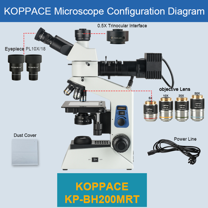 Packing List | 1. Eyepiece PL10X/18mm One Pair 2. Objective Lens 5X * 1 3. Objective Lens 10X * 1 4. Objective Lens 20X * 1 5. Objective Lens 50X * 1 6. Microscope Body * 1 7. Trinocular Lens * 1 8. Power Cord * 1 9、Dust Cover *1 Note: 1、This Product Has Upper and Lower Lighting System. 2、This product does not include polarizer inserts or analyzer inserts. |