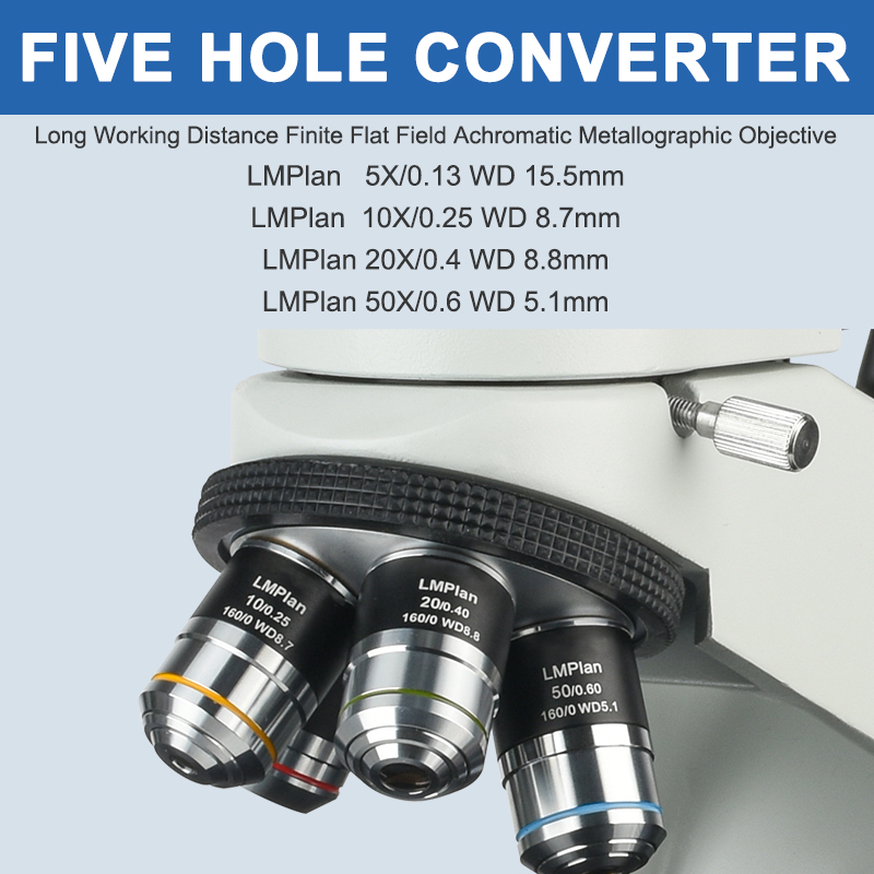 Objective Lens | Long Working Distance Finite Flat Field Achromatic Metallographic Objective LMPlan 5X/0.13 WD 15.5mm LMPlan 10X/0.25 WD 8.7mm LMPlan 20X/0.4 WD 8.8mm LMPlan 50X/0.6 WD 5.1mm |