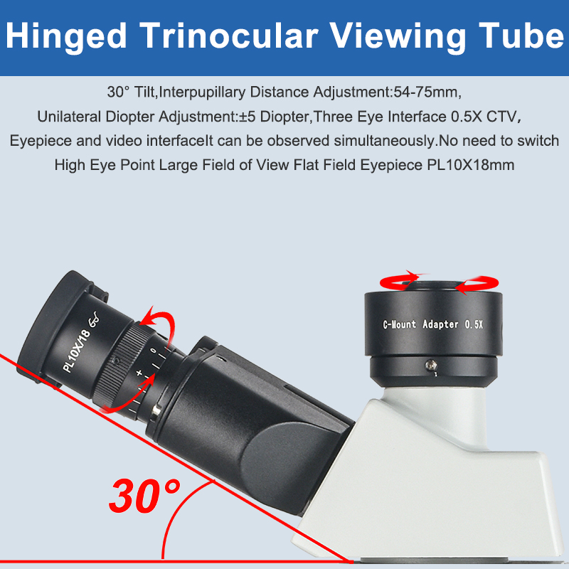 Observation Tube | 30° Tilt,Inverted Image,Hinged Trinocular Viewing Tube,Pupillary Distance Adjustment Range 54-75mm |