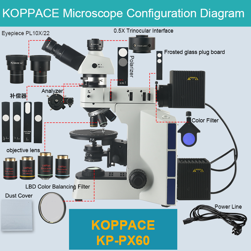 | Packing List | 1、Eyepiece PL10X/22mm one Pair 2、Three-lens includes 0.5X interface *1 3、Objective Lens LMPlan 5X/0.15 POLWD 10.8mm *1 4、Objective Lens LMPlan 10X/0.3 POL WD 12.2mm *1 5、Objective Lens LMPlan 20X/0.45 POL WD4mm *1 6、Objective Lens LMPlan FLN 50X/0.55 POL WD7.9mm *1 7、The Microscope Body *1 8、light Box Power Cord *1 9、Polarizing Mirror *1 10、Analyzer Mirror *1 11、Round Platform *1 12、LBD Color Filter Group (White Light) *1 13、λ Piece,λ/4 Pieces,Quartz Wedge *1 14、Color Filter *1 15、Condenser *1 |