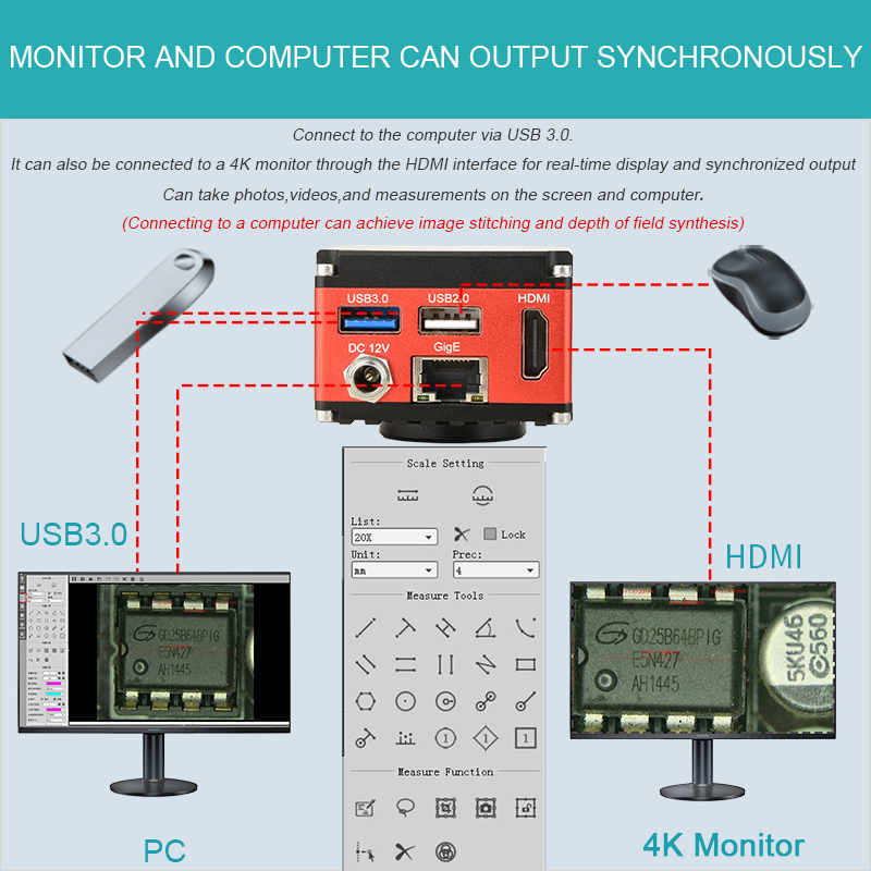 | Note | 1. This product is HDMI/LAN LAN/USB3.0 output, Connect directly to the monitor through an HDMI cable, or connect to a computer through a network cable/USB 3.0 interface for use. 2. This product has two USB ports, one for connecting to a mouse and the other USB 3.0 for connecting to a computer. (You can also set up an interface to connect to a USB drive and an interface to connect to a mouse). 3. Photography,video recording,and measurement can be achieved on both the monitor and computer. 4. This product does not contain a monitor. |