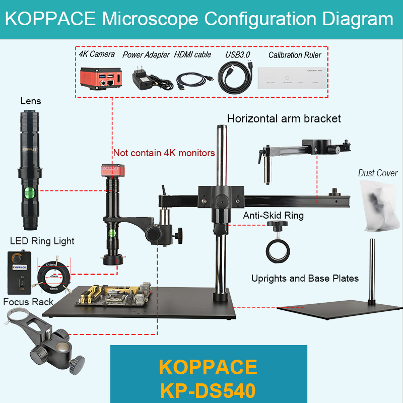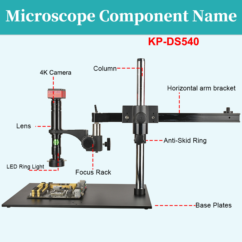| Packing List | 1. Uprights and Base Plates *1 2. Focusing Bracket *1 3. Anti-Skid Ring *1 4. Continuous Zoom Lens *1 5. Cross arm Bracket *1 6、LED Ring Light *1 7、Dust Cover *1 8、4K Camera *1 9、HDMI Line *1 10、The Camera Power Adapter *1 11、Calibrating Ruler *1 12、USB 3.0 Line *1 |