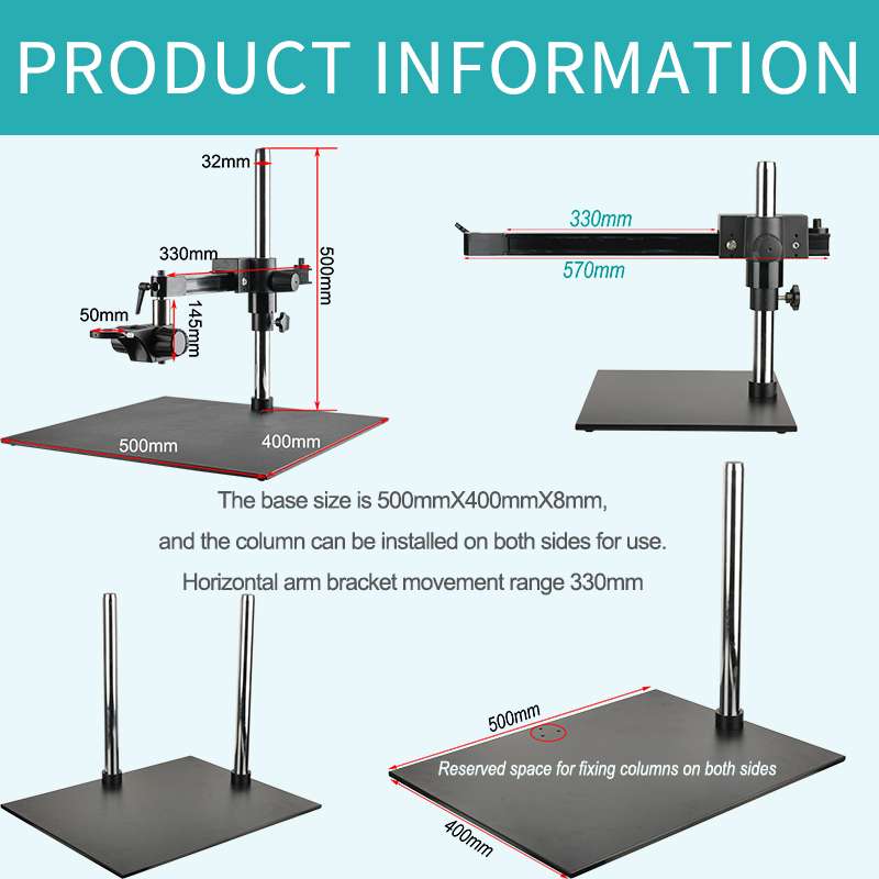 | Bracket Size | Horizontal arm movement range:330mm,column height 500mm, Base size 500mmX400mmX8mm lens aperture 50mm |