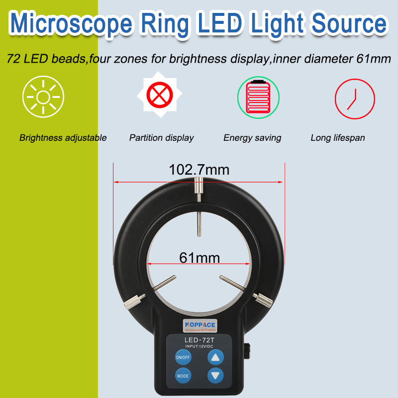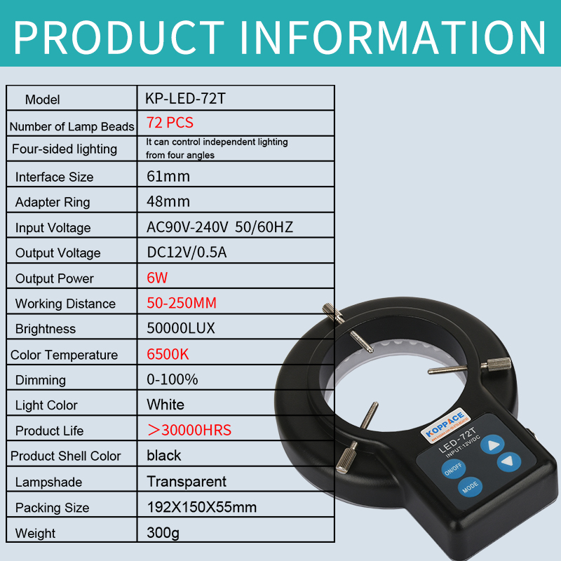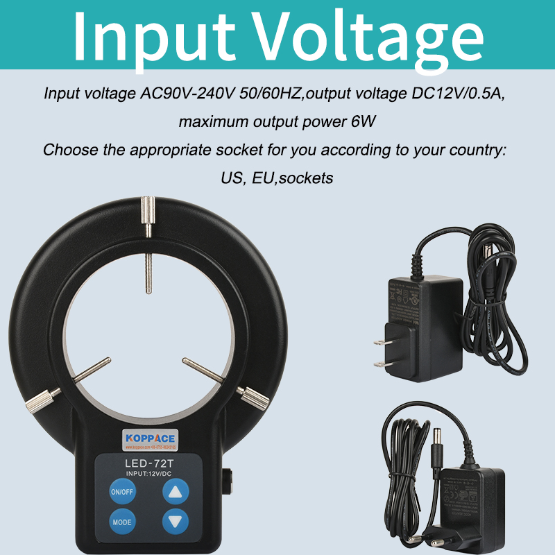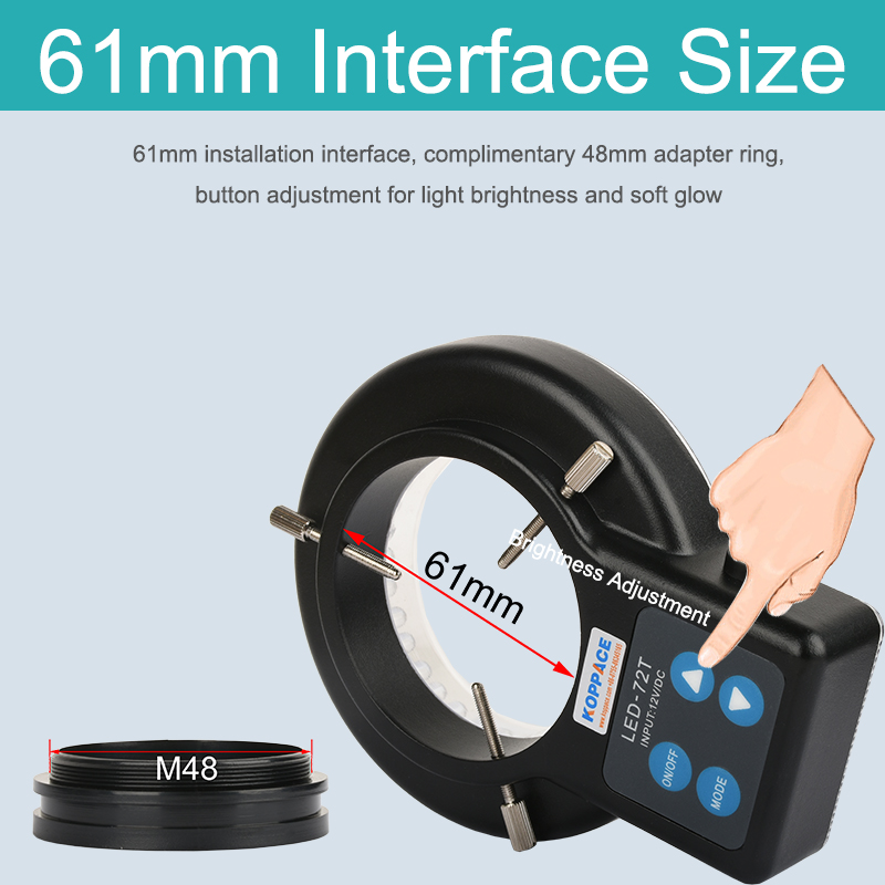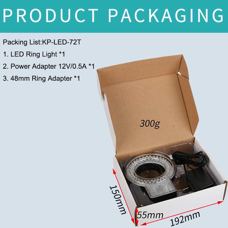 | Packing List: 1. LED circular light *1 2. Power adapter 12V/0.5A *1 3. 48mm ring adapter *1 We Will Provide Suitable EU Plug,US Plug According to the Country/Region Where the Client is Located. |