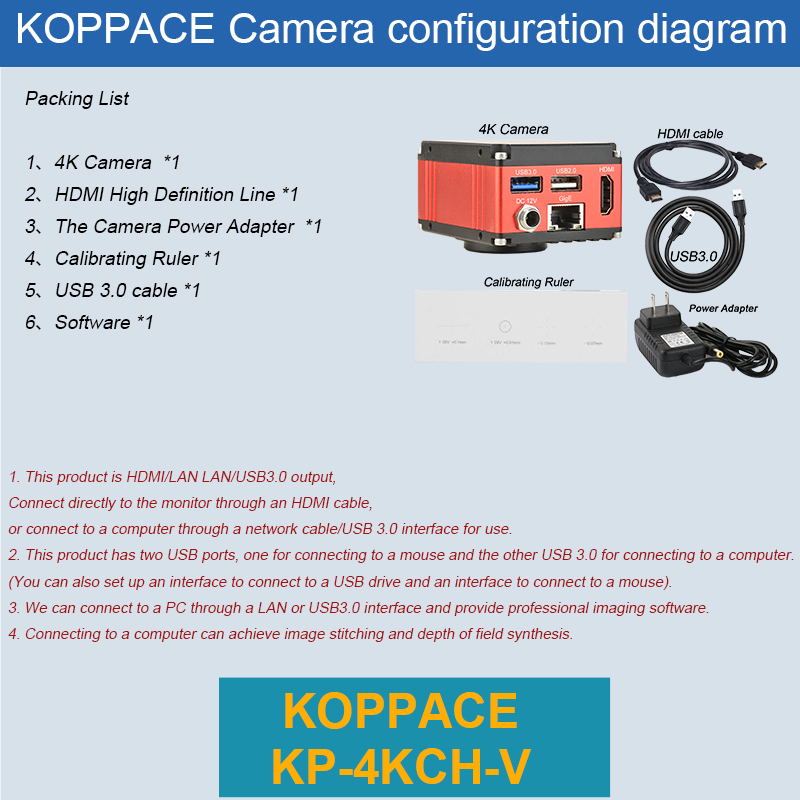 Note | 1. This product is HDMI/LAN LAN/USB3.0 output, Connect directly to the monitor through an HDMI cable, or connect to a computer through a network cable/USB 3.0 interface for use. 2. This product has two USB ports, one for connecting to a mouse and the other USB 3.0 for connecting to a computer. (You can also set up an interface to connect to a USB drive and an interface to connect to a mouse). 3. We can connect to a PC through a LAN or USB3.0 interface and provide professional imaging software. 4. Connecting to a computer can achieve image stitching and depth of field synthesis. |