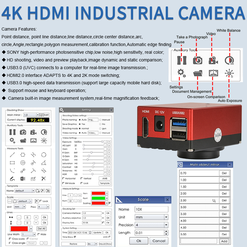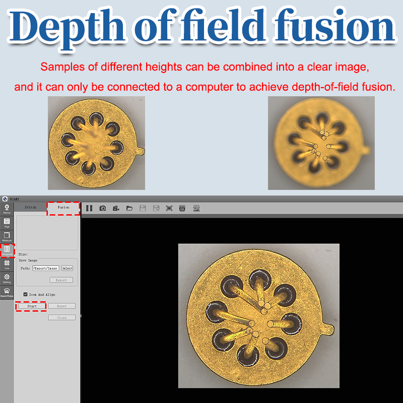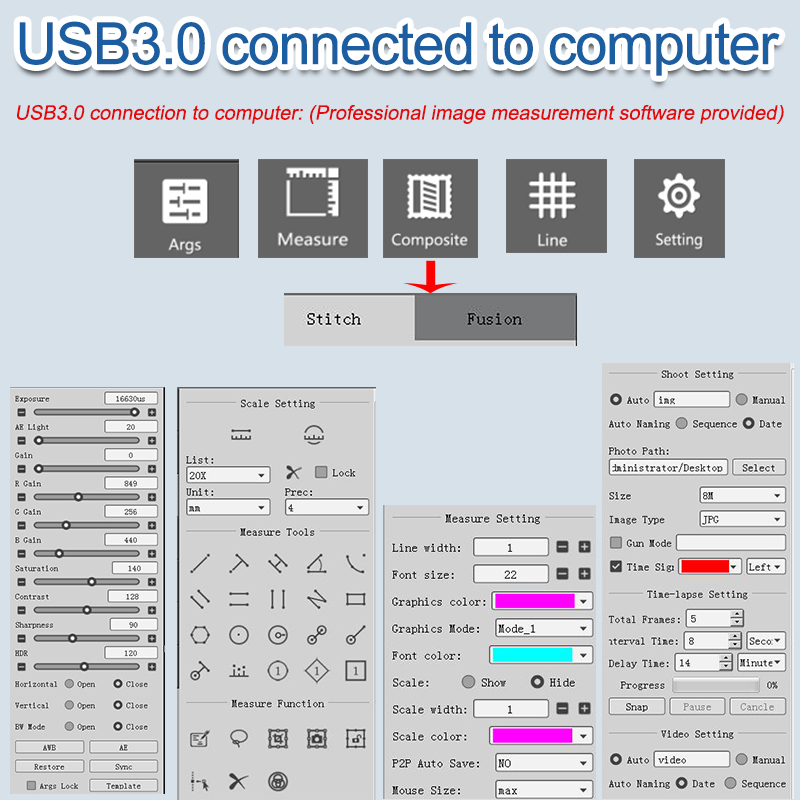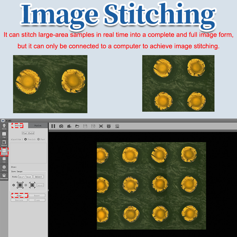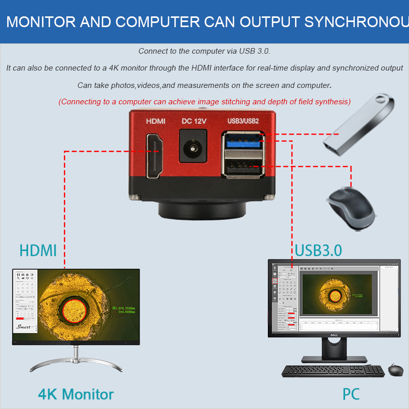 | Note | 1. This product features HDMI/USB3.0 output. It can be directly connected to a monitor via an HDMI cable or connected to a computer via a USB3.0 interface for use.Provide professional imaging software. 2. This product has two USB ports, one for connecting to a mouse and the other USB 3.0 for connecting to a computer. (You can also set up an interface to connect to a USB drive and an interface to connect to a mouse). 3. Connecting to a computer can achieve image stitching and depth of field synthesis. |